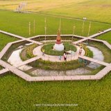 หลายๆ คนอาจจะเคยมาเห็นสะพานไม้ที่ทอดยาวไปในทุ่งนากันมาบ้างแล้วๆ ในหลายๆ ที่ แต่เราขอบอกเลยว่าที่นี่นั้นมีความวิจิตรงดงามไม่เหมือนที่ใด เป็นสะพานไม้กลางนาบุญที่เหมาะจะมาท่องเที่ยวชมความสวยงามจริงๆ สะพานไม้ทั้งสี่ทางที่มุ่งตรงสู่จุดกึ่งกลางของทุ่งนา ตรงกลางประดิษฐานสิ่งศักดิ์สิทธิ์ของทางวัดเอาไว้ เป็นประติมากรรมที่ผสมผสานระหว่างธรรมชาติและศาสนาเอาไว้ได้อย่างลงตัว